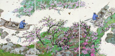 “芳草鮮美,落英繽紛。漁人甚異之,復(fù)前行,欲窮其林。”蔡皋輕聲道,“異”就是驚奇,正因有了好奇,才讓漁人鼓足勇氣,探尋奇境。“我傾注筆墨,來(lái)描繪漁人發(fā)現(xiàn)桃花源的整個(gè)過(guò)程。”