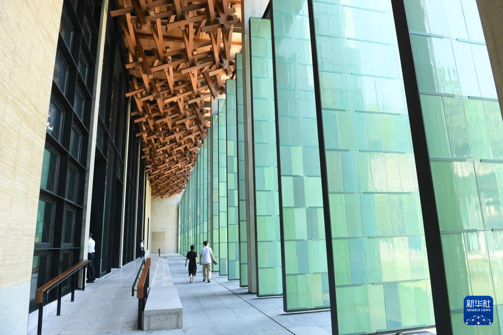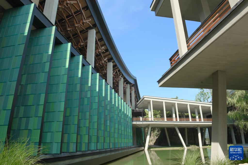 杭州國家版本館屋頂?shù)哪緲嫼颓啻砷T扇相映成趣(7月23日攝)。