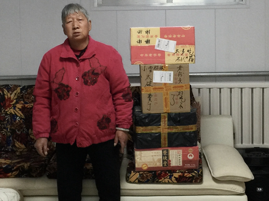 孫洪正老伴站在賈永婷寄來(lái)的快遞旁合影。受訪者供圖