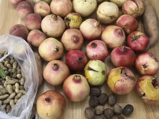 2019年10月10日收到一箱果品,一張字條寫著:“甜石榴21個(gè),酸石榴5個(gè)(石榴皮上有膠帶和‘酸’字),甜梨5個(gè),美人紅桃子,地瓜2塊,花生,核桃(不好看,請(qǐng)品嘗)。”