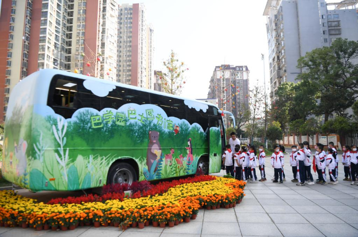 近日,長沙市青園友誼小學的巴士圖書館開館,吸引學生們前來閱讀、體驗。巴士圖書館由一臺廢棄巴士改造而成,目前共藏書4000多冊。