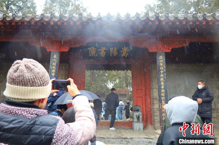 中新網(wǎng)鄭州2月23日電 (王迪)春雪依依,古柏森森,紅墻青瓦間傳出幾句儒家經(jīng)典的吟誦之聲……在22日的“寫意中國——探訪漢字起源”主題宣傳采訪中,記者探訪了河南登封市區(qū)北約二公里處嵩山南麓的嵩陽書院。是日清晨,登封忽降細雪,映襯得整個嵩陽書院愈發(fā)肅穆。美景難得,引得游人紛紛駐足欣賞,拍照留念。