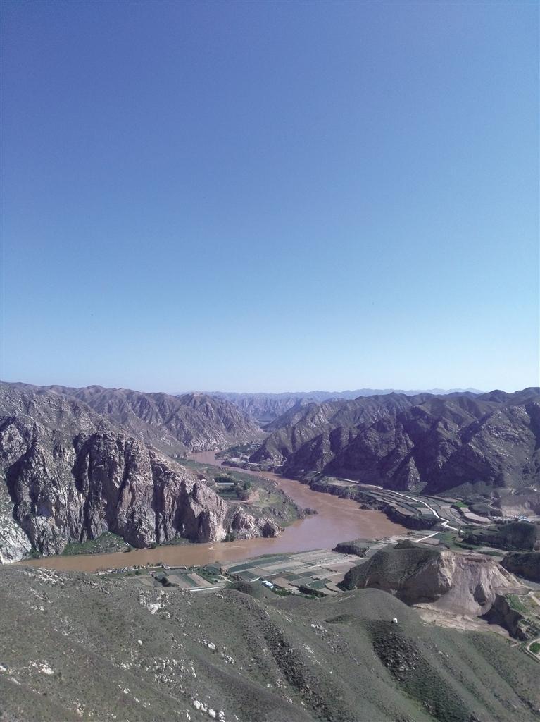 向西鳥(niǎo)瞰黃河,黃河幾乎直線(xiàn)撲面而來(lái),河水發(fā)黃,流淌緩慢。過(guò)去這里,河水湍急,老遠(yuǎn)就能聽(tīng)到咆哮之聲。由于20世紀(jì)末,在下游20公里處建了小峽水庫(kù),河水被抬升,河水流緩。黃河北面,依然是光禿禿的山巒。低頭看腳下的黃河,南岸的漢長(zhǎng)城遺址清晰可見(jiàn),旁邊有二三個(gè)人在農(nóng)田勞作。黃河流到此處,被腳下的九圪垯山迎面阻擋,折而向北,切開(kāi)重重山巒,帶著野性,蜿蜒而去,一點(diǎn)兒也不留戀桑園子峽,不留戀九圪垯山,不留戀滄桑的大地和歲月。