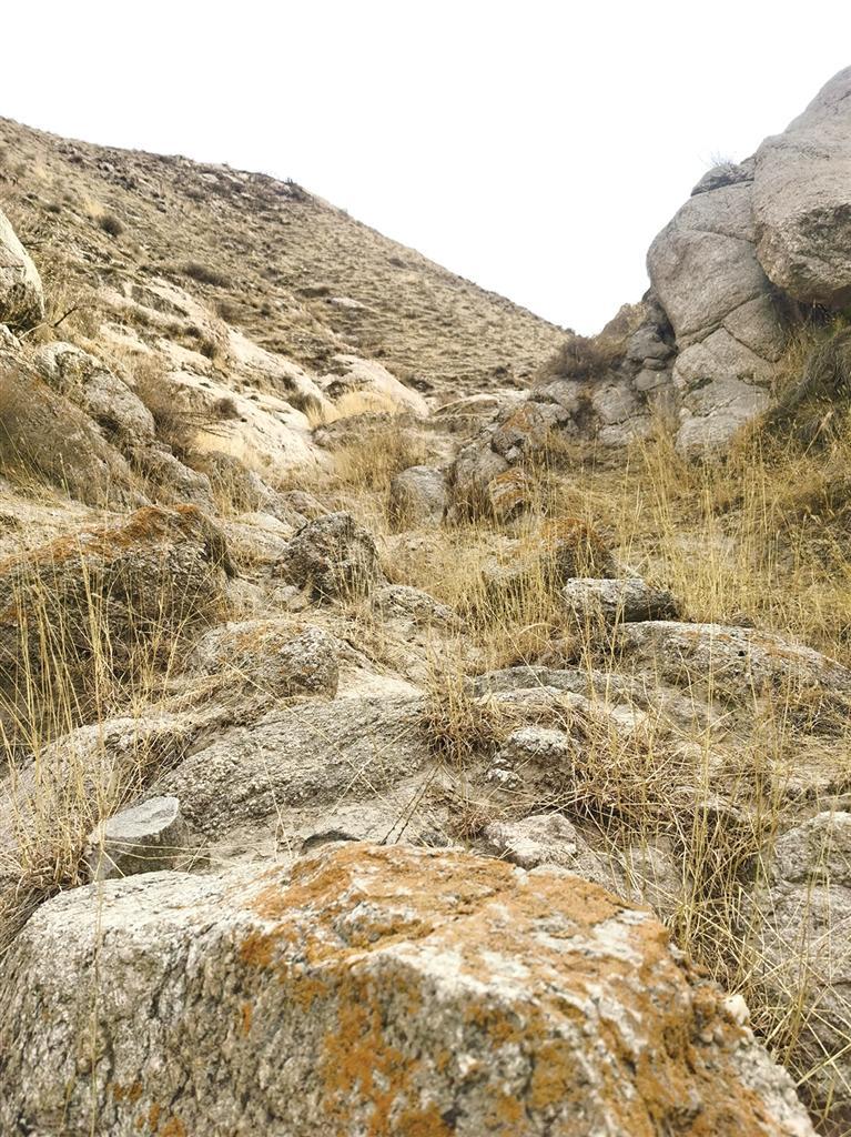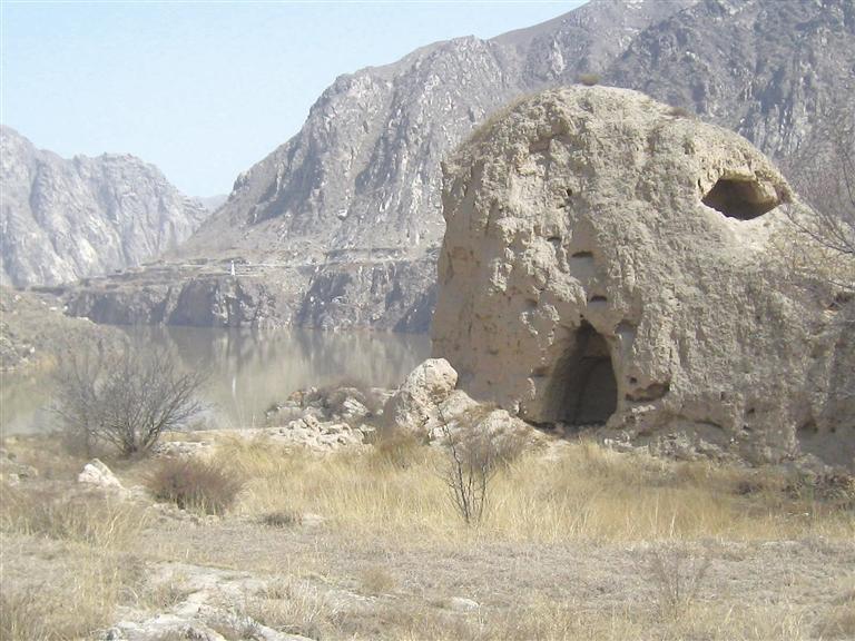 東坪向東300米,就是榆中境內(nèi)唯一遺留的一處漢長(zhǎng)城遺址,該遺址現(xiàn)只有一處墻墩,緊鄰黃河,圍長(zhǎng)40 余米,高約5米,無(wú)任何防護(hù)措施,墻壁上,有磚、石混雜其中,人工夯筑之痕清晰可辨。西側(cè)墻面上,還有人掏挖的小窯洞。高1.3米,深達(dá)50厘米。破壞嚴(yán)重。漢長(zhǎng)城遺址再向東200米,東金公路向右拐入七峴溝,向來(lái)紫堡川而去,而黃河則被東面的大山阻擋,無(wú)路可去,左拐北折而流向什川。此處就是著名的黃河大“幾”字灣的第一灣。第一灣的南岸,有十來(lái)戶(hù)人家,地名叫駱圈灣。由于地處古絲綢之路,曾建有駱駝圈和小型客棧供駱駝客隊(duì)歇腳而又在黃河拐彎處而得名,后來(lái),因諧音,叫羅泉灣。山腳下,有七八棵楊柳已吐綠。沿黃河,已無(wú)路可尋,就沿洪水沖的山溝上東山,還是無(wú)路,甚至沒(méi)有羊腸小道,巖石裸露,怪石嶙峋,坡陡難行。巖石層只有七八十米厚。此山的石頭,含有石英成分,石質(zhì)軟,無(wú)開(kāi)采利用價(jià)值。再往上,就是黃土層,直到山頂。由于干旱,整個(gè)山上,無(wú)一棵樹(shù)木,甚至連灌木都沒(méi)有。耐堿耐旱的駱駝蓬只發(fā)出二厘米的枝蔓,一些蒿草和矮草,也剛發(fā)芽,還有一些匍匐在地面的無(wú)名小草,卻已開(kāi)出了扁豆大小的艷麗的小花,有白色的和淡藍(lán)色的蝴蝶飛起飛落。爬到半山腰,太陽(yáng)已全面照曬,山坡雖陡峭,卻無(wú)陰涼可乘。渾身發(fā)熱,不得不解開(kāi)衣扣,緩慢前行。