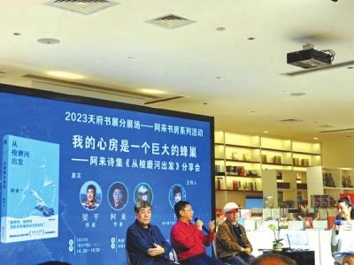 2023天府書展,各種名家分享會(huì)讓讀者應(yīng)接不暇。除了成都世紀(jì)城新會(huì)展中心主會(huì)場(chǎng),分會(huì)場(chǎng)的活動(dòng)也精彩紛呈。10月15日下午,在西部文化產(chǎn)業(yè)中心阿來書房,阿來、葉舟、梁平三位名家開啟“我的心房是一個(gè)巨大的蜂巢——阿來詩集《從梭磨河出發(fā)》分享會(huì)”。三人上演老友記,分享會(huì)由阿來的青春期談起,氛圍詼諧幽默、愜意深情。
