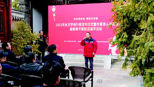 近日,由王若冰文化工作室組織評選的“2023天水文學排行榜”上榜作品揭曉,15位作家的15篇(部)作品榮登榜單。同時,2023天水文學排行榜發(fā)布儀式暨作家詩人書畫家“迎新春 寫春聯(lián) 送福字”活動在天水古城三號院舉行。