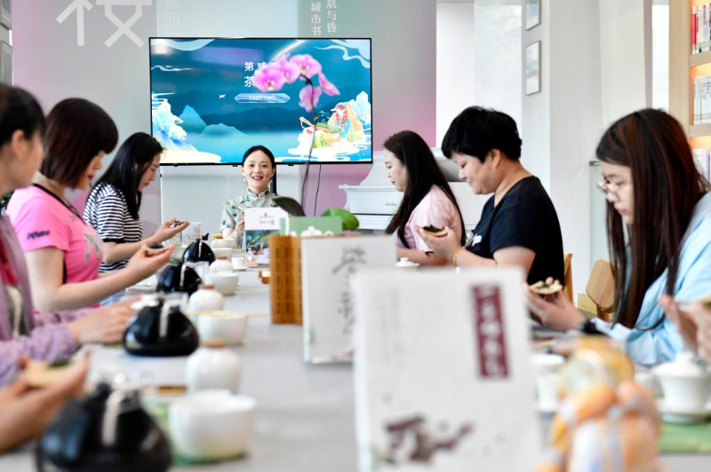 5月23日,市民在日照市東港區(qū)城市書房櫻花園館學(xué)習茶藝。