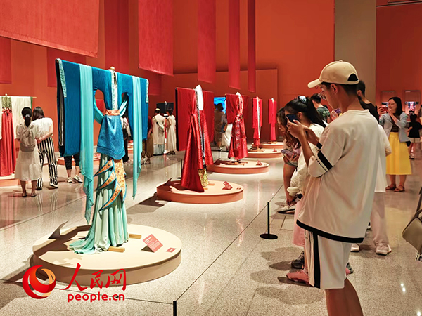 7月20日,正值周末,中國工藝美術館(中國非物質(zhì)文化遺產(chǎn)館)“五彩錦簇——中華服飾文化展”的展廳里人流如織。有人舉起手機拍照留念,有人駐足了解精湛的織造工藝,還有人在與同伴討論哪里能買到“同款”衣裝……這場中華服飾的視覺盛宴,讓眾多游客沉浸其中。
