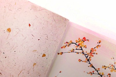 低首聞香,竹葉紙、桂花紙、蠟梅紙散發(fā)著獨有清香,在花葉紙上還能夠觸摸到真實的植物肌理;荸薺紙、無患子紙等果實紙上融入了肉眼可見的顆顆果粒;蜀葵紙、黃山欒紙、柿子紙等植物染色紙色彩繽紛,浸染著植物的天然原色;水印紙薄如蟬翼,透光可見植物圖案……摩挲間,24種花草紙有著獨屬于不同時節(jié)的味道,自然之美,蘊蓄其中。