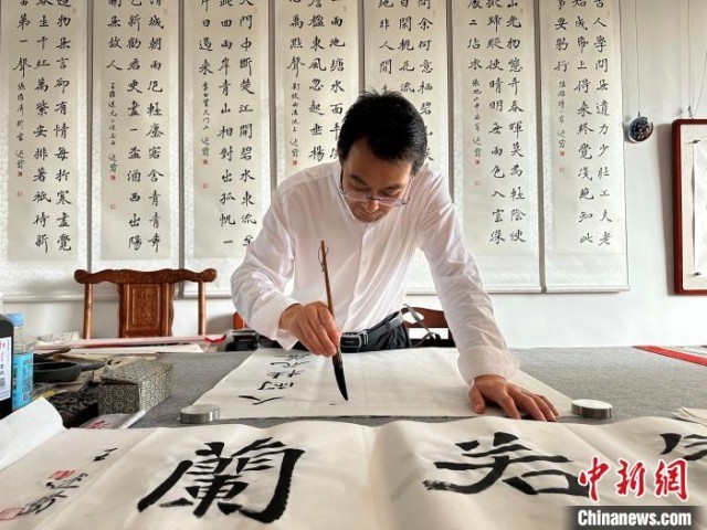 當日,中新網(wǎng)記者跟隨通渭詩會采訪團走進通渭悅心國際書畫村。“我們這里重視寫字是刻在骨子里的,書法特長班比重遠高于音樂舞蹈等,而且從小學(xué)至高中每周有兩節(jié)書法課程。”工作人員冉盼盼說,由于祖輩傳承,書法在通渭不衰反盛,當?shù)匾呀?jīng)形成了書畫裝裱、文房四寶銷售等完整產(chǎn)業(yè)鏈。