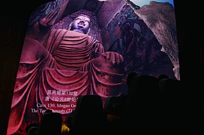 數(shù)字電影為游客欣賞敦煌藝術(shù)提供了全新的視覺體驗(yàn)。圖為7月26日,游客在敦煌莫高窟數(shù)字展示中心欣賞球幕電影《夢(mèng)幻佛宮》。