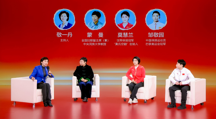 全國婦聯(lián)副主席(兼)、中央民族大學(xué)教授蒙曼,世界體操冠軍、“莫氏空翻”創(chuàng)始人莫慧蘭,中國體操運動員、巴黎奧運會冠軍鄒敬園接受訪談。新華網(wǎng) 發(fā)
