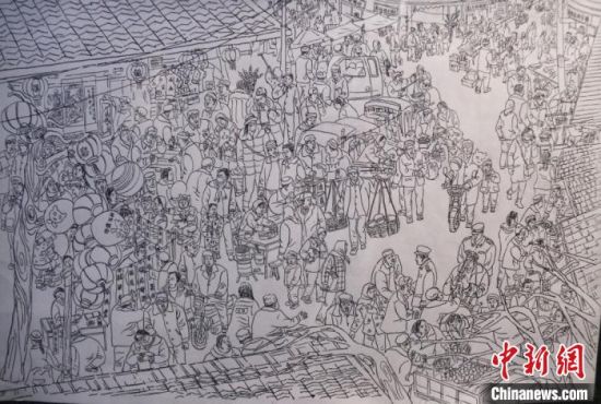 蘭州鋼筆畫愛好者周新平勾勒了數(shù)組關(guān)于鄉(xiāng)村記憶的鋼筆畫,其中,《隴西臘月圖》是他歷時(shí)三個(gè)多月,手繪了200多村民,完成的一幅舊時(shí)農(nóng)民過年趕集的熱鬧圖景:賣糖葫蘆的小販、剪紙賀春的手藝人、趕車挑擔(dān)的趕集人……周新平說,他很怕“集市文化”將來被人們遺忘,用鋼筆記錄下來,留住記憶里的“年味”以感悟鄉(xiāng)愁。
