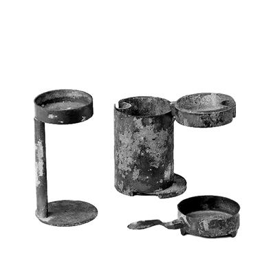 這件青銅鑄造的鼎形燈,收合時(shí)為附耳三足蓋鼎,內(nèi)盛燃燈時(shí)所用的油料,以子母口扣合。蓋中央為一突起的圓柱狀銎,蓋兩側(cè)為相對(duì)的二鴨首,其寬嘴正好銜住雙鍵,鼎蓋便被牢牢扣住。用燈時(shí),將雙鍵支起,可插入鼎蓋中心的圓銎中,鼎蓋即成為燈盞。鼎形燈構(gòu)造精巧,設(shè)計(jì)科學(xué),使用方便,封口嚴(yán)密不溢油,為貴族出行時(shí)使用的燈。