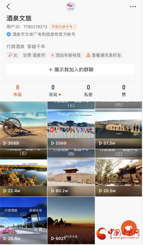 中國(guó)甘肅網(wǎng)3月19日訊 (本網(wǎng)記者 張?zhí)m琴)自2月18日甘肅省文旅廳聯(lián)合快手發(fā)起“甘肅文旅快手大V培訓(xùn)計(jì)劃”以來,“酒泉文旅”快手官方賬號(hào)和全市4A級(jí)景區(qū)景點(diǎn)、博物館的導(dǎo)游、講解員連續(xù)發(fā)布了一批有深度、有趣味、有內(nèi)涵的酒泉文旅短視頻,其中“酒泉文旅”快手官方平臺(tái)連續(xù)發(fā)布七期“行游酒泉 穿越千年”酒泉文化旅游形象宣傳短片,截至3月18日,在快手平臺(tái)流量扶持下,“酒泉文旅”快手官方平臺(tái)作品播放量達(dá)202.288萬次、點(diǎn)贊人數(shù)達(dá)55070人,單篇作品最高播放量達(dá)80.2萬次、點(diǎn)贊人數(shù)35193人。