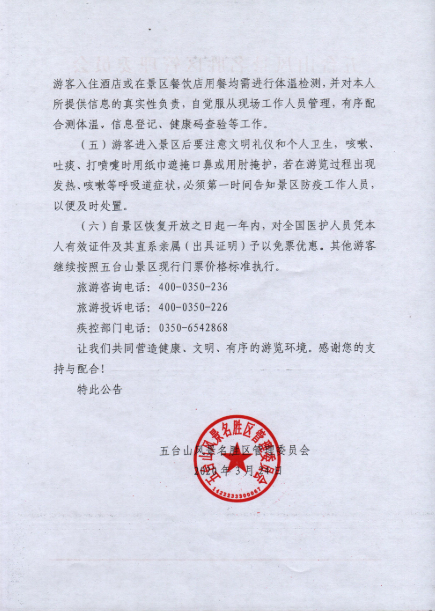 五臺(tái)山風(fēng)景名勝區(qū)強(qiáng)調(diào),恢復(fù)開放期間,五臺(tái)山將對(duì)景區(qū)人員密度進(jìn)行實(shí)時(shí)監(jiān)控。五臺(tái)山風(fēng)景名勝區(qū)管理委員會(huì)還宣布,自景區(qū)恢復(fù)開放之日起一年內(nèi),對(duì)全國(guó)醫(yī)護(hù)人員憑本人有效證件及其直系親屬(出具證明)予以免票優(yōu)惠。
