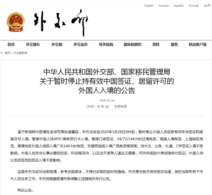 3月26日,中華人民共和國外交部、國家移民管理局發(fā)布《關(guān)于暫時停止持有效中國簽證、居留許可的外國人入境的公告》(以下簡稱《公告》),決定28日起,暫時停止外國人持目前有效來華簽證和居留許可入境。