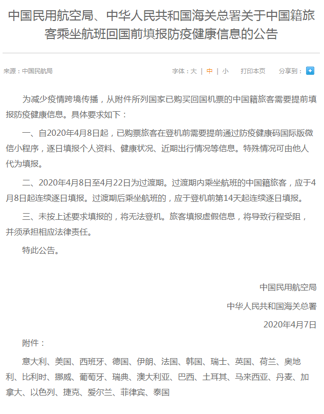 中國(guó)民用航空局、中華人民共和國(guó)海關(guān)總署4月7日聯(lián)合發(fā)布《關(guān)于中國(guó)籍旅客乘坐航班回國(guó)前填報(bào)防疫健康信息的公告》(以下簡(jiǎn)稱《公告》)?!豆妗分赋?,自4月8日起,從意大利、美國(guó)、西班牙等26個(gè)國(guó)家已購買回國(guó)機(jī)票的中國(guó)籍旅客需要在登機(jī)前提前填報(bào)防疫健康信息,包括逐日填報(bào)個(gè)人資料、健康狀況、近期出行情況等。旅客未按要求填報(bào)的,將無法登機(jī);填報(bào)虛假信息,將導(dǎo)致行程受阻,并須承擔(dān)相應(yīng)法律責(zé)任。