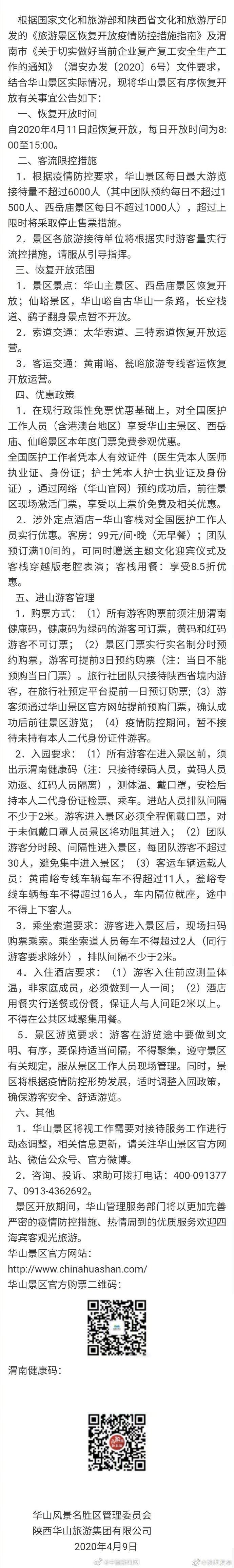 公告強調,根據(jù)疫情防控要求,華山景區(qū)每日最大游覽接待量不超過6000人(其中團隊預約每日不超過1500人、西岳廟景區(qū)每日不超過1000人),超過上限時將采取停止售票措施。
