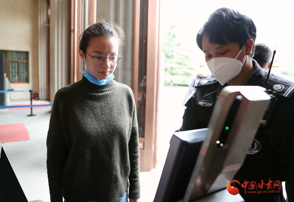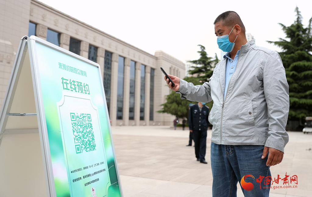 5月8日,在甘肅省博物館入口,一位市民正在通過(guò)在線預(yù)約的方式入館參觀。