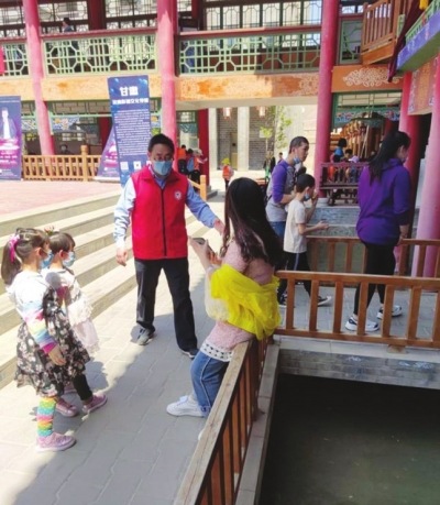 志愿者們不懼烈日,在古鎮(zhèn)開展文明勸導(dǎo)工作。當(dāng)游客走累了,靠在欄桿處休息時(shí),志愿者立即走過去耐心勸導(dǎo)游客,說明此處危險(xiǎn),并向游客指明休息場(chǎng)所;當(dāng)有游客爬到景區(qū)禁止攀爬的設(shè)施上照相時(shí),志愿者們耐心勸導(dǎo),引導(dǎo)游客文明照相。在閑暇之余,志愿者還要在古鎮(zhèn)內(nèi)撿煙頭、撿落地垃圾等。