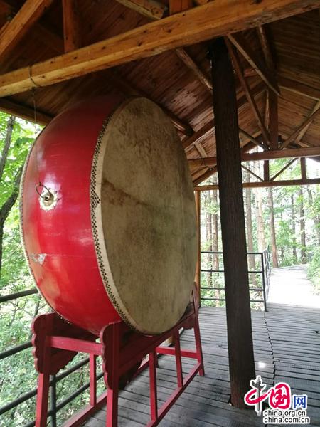 不知是何等神力相助,我竟然氣不急喘,腿不灌鉛,一口氣沖到了大鐘處。在一處長(zhǎng)約兩百米,寬約五六米的突兀石崖下,竟然有一條長(zhǎng)百米寬約三米的平坦棧道,直抵懸崖石壁,仿佛一條地道的天街。從懸崖上吊掛下來(lái)一尊重達(dá)千斤的銅鐘,鐘邊吊一根木質(zhì)鐘錘,錘身已裂開,兩頭均被撞成起毛的“絨團(tuán)”,由此可知,到達(dá)此處撞鐘的勇士并非少數(shù)。我乘興上去重重地撞了九下,雄渾、恢弘的鐘聲,在峽谷上空久久地回蕩。