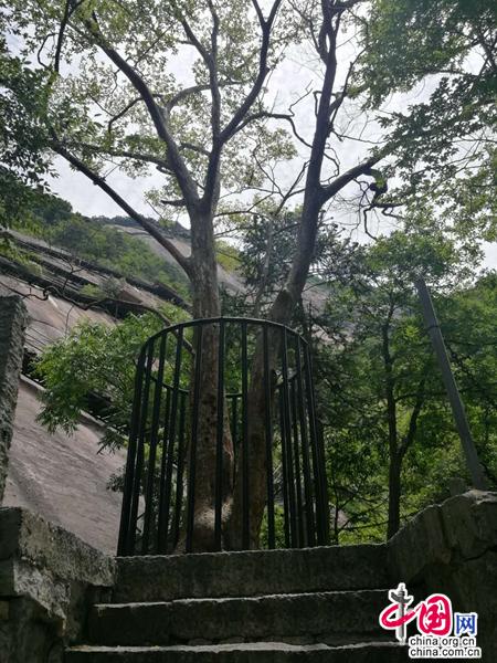 于是,我開始沿著陡峭的石階,一步一步地向上攀登。上不過(guò)百余級(jí),一株如巨傘狀的天目紫莖躍然眼前。樹四周用茶杯粗細(xì)鋼筋柵欄緊緊圍住,可見(jiàn)景區(qū)對(duì)此珍貴名木的重視。仔細(xì)觀察,估計(jì)樹齡至少在500年以上,其主干樹皮細(xì)滑,骨感十足,上部枝丫自然舒展,覆蓋出去,周圍各色綠樹恰似眾星拱月般,與其相擁成趣。