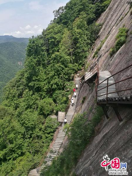 我鼓足勇氣,繼續(xù)一級(jí)一級(jí)向上攀登,一邊不斷地拍下照片。我時(shí)不時(shí)地打開手機(jī),既怕電量不夠,更怕內(nèi)存已滿。看到那些?入絕壁的龍須草、黃山松、銳齒槲櫟、映山紅……它們就像是一幅幅色彩艷麗的天然壁畫,不僅給了我美的享受,詩(shī)的靈感,更是給了我一種一往無(wú)前、奮力攀登的豪情和力量。