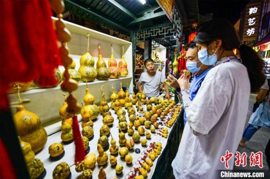 圖為游客購(gòu)買刻葫蘆工藝品?!⊥醣筱y 攝
