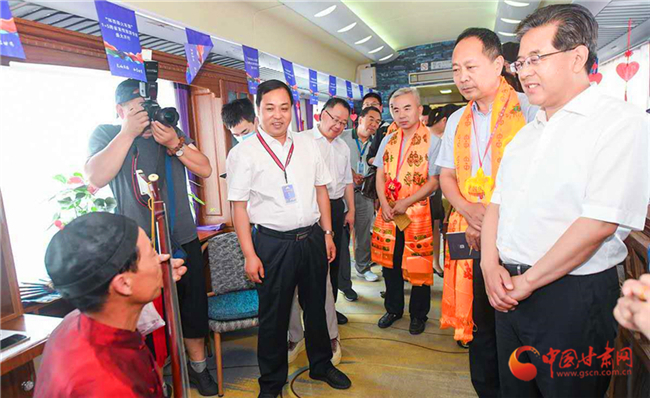 專列到達(dá)西安南站后,陜西省文旅廳及文旅相關(guān)部門對(duì)“環(huán)西部火車游”專列的到來表示熱烈的歡迎,陜西省文旅廳負(fù)責(zé)人在甘肅省委宣傳部副部長、省文旅廳黨組書記、廳長陳衛(wèi)中和武威市文體廣電和旅游局負(fù)責(zé)人的陪同下參觀了“環(huán)西部火車游”武威館,并欣賞了國家級(jí)非遺項(xiàng)目“涼州賢孝”表演。