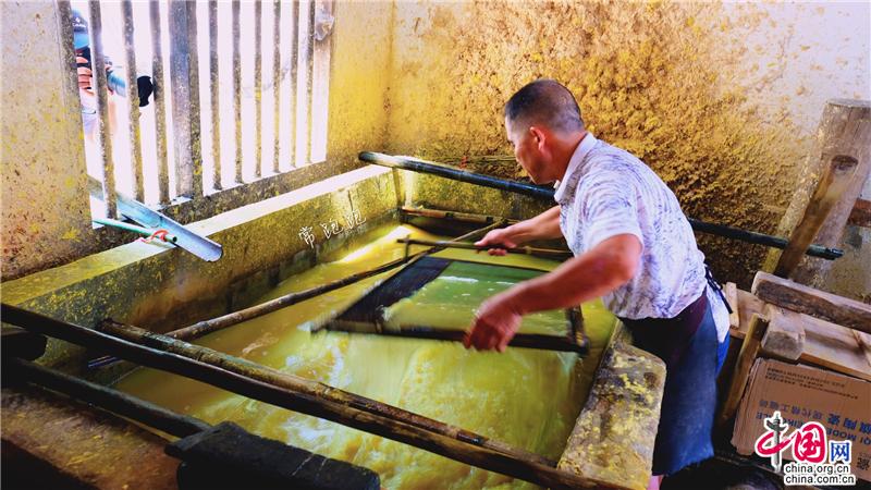 隆回縣灘頭鎮(zhèn)桃林村手工抄紙作坊,已經(jīng)成為一處著名的文旅項(xiàng)目景點(diǎn)。走進(jìn)陶林村,一棟棟青瓦石墻的新屋吸引了人們的目光。屋外山坡竹林茂密,山溪流水潺潺,屋內(nèi)手工抄紙制作的原料、工具布置的次序井然,手工抄紙的全套工藝流程在這幾棟屋中得以完整體現(xiàn)。手工抄紙技術(shù)歷史悠久,始于隋唐,至明朝時(shí)抄紙已經(jīng)非常盛行。上世紀(jì)八十年代鼎盛時(shí)還曾遠(yuǎn)銷(xiāo)東南亞和日本。非遺傳承人李志軍今年61歲,自稱“紙蟲(chóng)”,帶領(lǐng)著全家人承襲著祖宗留下的獨(dú)特技藝。而支撐著李志軍的堅(jiān)守的,是隆回縣文旅部門(mén)的巨大付出和努力。2011年,他們支持李志軍建立了手工抄紙標(biāo)準(zhǔn)化作坊,2016年又對(duì)該作坊進(jìn)行擴(kuò)建,使之成為國(guó)家級(jí)非遺項(xiàng)目。灘頭手工抄紙作坊占地面積1714平方米,是灘頭手工抄紙有史以來(lái)最大的作坊,同時(shí)也是集生產(chǎn)、創(chuàng)新、傳承、展示、研學(xué)為一體的重要基地和文旅基地。