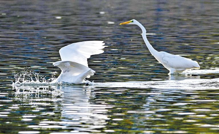 10月上旬,鳴沙山下大片水域吸引了大批的白鷺、白天鵝、鸕鶿、鷗鳥(niǎo)前來(lái)嬉戲、覓食。
