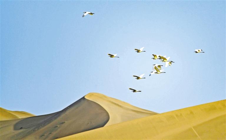 圖說(shuō)甘肅丨鳴沙山下大漠濕地白鷺起舞