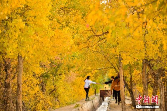 秋風(fēng)漸涼,秋色漸濃,地處絲綢之路黃金旅游段的甘肅敦煌,大漠戈壁上地勢低洼的地方或有河流經(jīng)過的地方,都會有大片大片的原始胡楊林,用金黃色璀璨奪目的色彩展示醉人的秋意,一輛輛車??吭诼愤?,三五成群的游客徒步前往戈壁深處觀賞醉人的胡楊秋色。王斌銀 攝