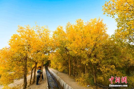 圖為胡楊秋色吸引不少游客和敦煌市民前來賞秋。 王斌銀 攝