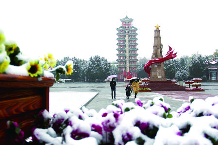 10月27日,游客冒雪參觀甘肅紅軍會(huì)寧會(huì)師舊址。當(dāng)日,會(huì)寧縣迎來今秋首場(chǎng)降雪。 常琦彪 攝