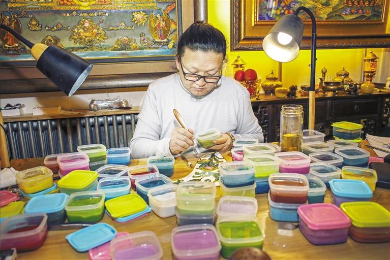 據(jù)李海明介紹,近年來,經(jīng)常會(huì)受邀代表甘肅省文創(chuàng)去省外參展,而每次展出的琺瑯文創(chuàng)產(chǎn)品都會(huì)受到來自各地的年輕人的好評(píng)。“有時(shí)會(huì)把不同人創(chuàng)作的壁畫、唐卡等擺在一起展出,總有很多年輕人在我的作品前逗留良久,這說明他們對(duì)我的琺瑯釉色彩是非常認(rèn)可的。”