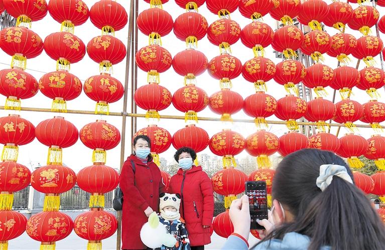 春節(jié)臨近,臨夏市街道、社區(qū)、公園張燈結(jié)彩,處處呈現(xiàn)一派喜慶祥和的節(jié)日氣氛。圖為市民們在東郊公園紅燈籠前拍照。 記者 史有東 攝