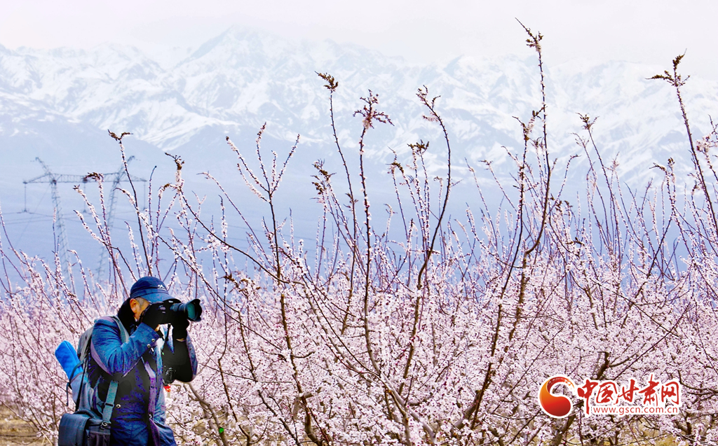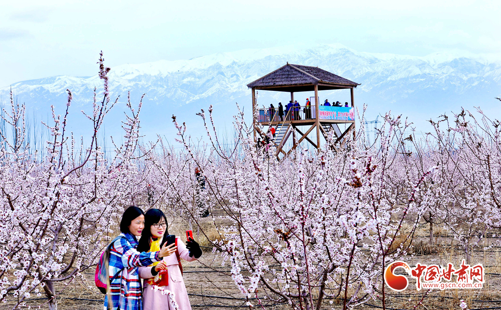 4月3日,游客在祁連山下的甘肅張掖甘州區(qū)金滿園千畝杏園種植基地里賞花和拍照留念。