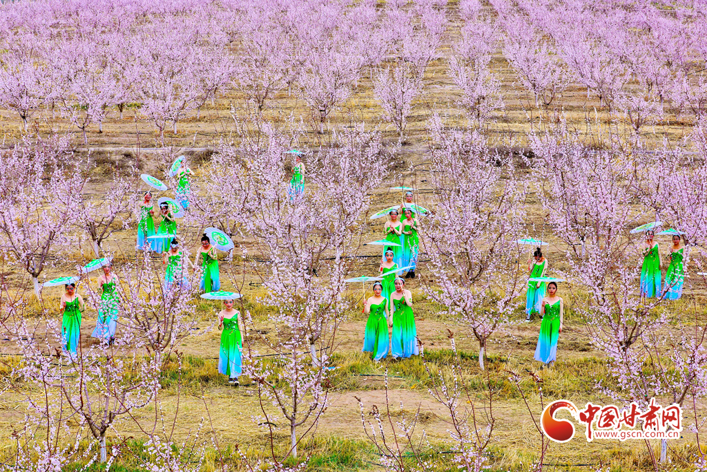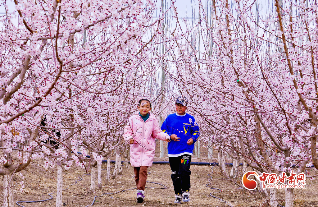 4月3日,小朋友在甘肅張掖甘州區(qū)金滿園千畝杏園種植基地杏花園里跳起了《春之舞》。