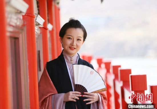 圖為蘭州青年身穿漢服在百年梨園賞景。 高展 攝