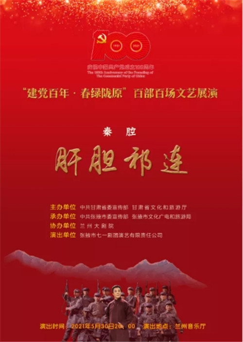 中國(guó)甘肅網(wǎng)5月28日訊(本網(wǎng)記者 宋芳科)5月30日晚,剛剛斬獲第六屆甘肅戲劇紅梅獎(jiǎng)大賽“紅梅劇目獎(jiǎng)”第一名的好成績(jī)的秦腔戲《肝膽祁連》,將在蘭州音樂廳精彩上演?!陡文懫钸B》以真實(shí)的歷史故事改編,講述了民主人士高金城營(yíng)救紅西路軍戰(zhàn)士的感人故事。屆時(shí),中國(guó)甘肅網(wǎng)將現(xiàn)場(chǎng)直播,歡迎廣大網(wǎng)友點(diǎn)擊進(jìn)入直播間,重溫一段波瀾壯闊而又感人至深的歷史,一起向祁連英魂高金城致敬。