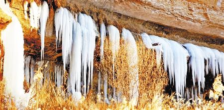 小路隨著山勢,曲折延伸。對(duì)面荒坡上隨處可見大大小小的洞穴,不知是經(jīng)年風(fēng)蝕,還是人工開采沙子所致。洞穴四周,散落著小小的冰瀑,有的似乎只有盈盈一握。長長短短的冰掛,一綹一綹,一排一排,遠(yuǎn)遠(yuǎn)近近錯(cuò)落有致地覆在山坳里,垂在砂石間,掛在懸崖上。一些細(xì)細(xì)長長的冰溜,像極了臘月里母親剛出鍋的粉條。搭在院子竹竿上的一掛粉條,下邊還垂著水珠,上邊早已凍成了細(xì)細(xì)的冰棒,而滴落在地上的水已凝成了冰堆。