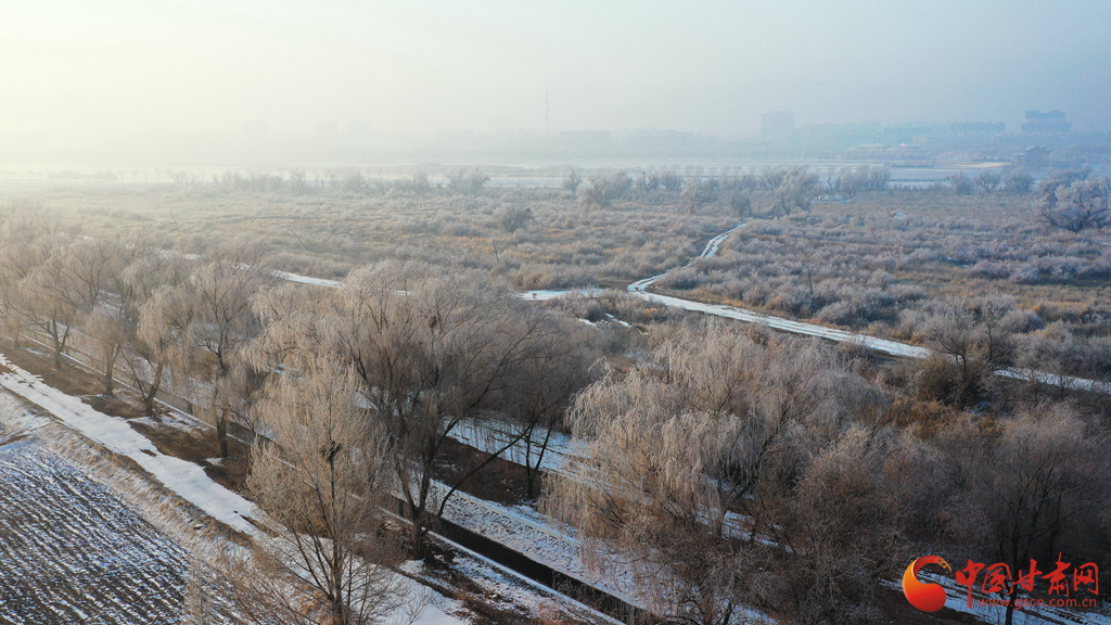 張掖市高臺(tái)縣黑河國(guó)家城市濕地公園的霧凇景觀。