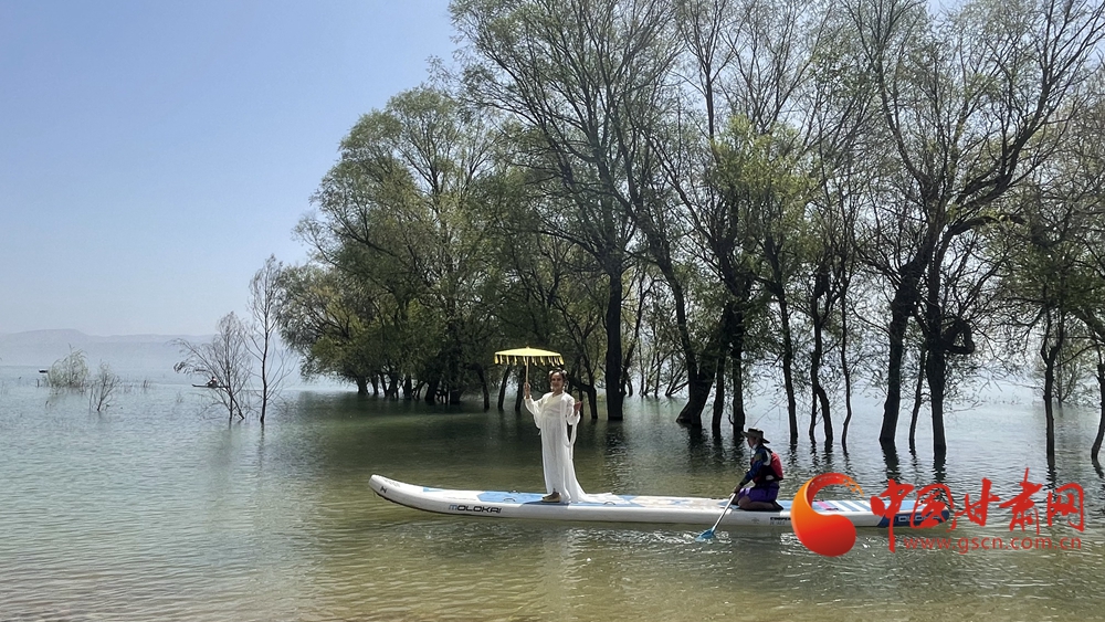 春日,炳靈湖水位上漲,碧波蕩漾,垂柳依依,槳板愛好者和游客在湖面上蕩舟嬉戲,游覽春色。