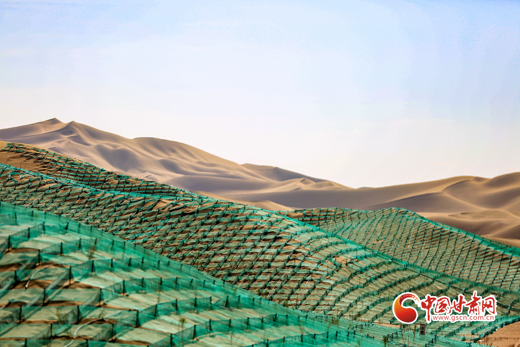 5月14日,在甘肅省酒泉市金塔縣鼎新鎮(zhèn),一片片種植梭梭的阻沙網(wǎng)排列有序,讓風(fēng)沙得到有效治理。