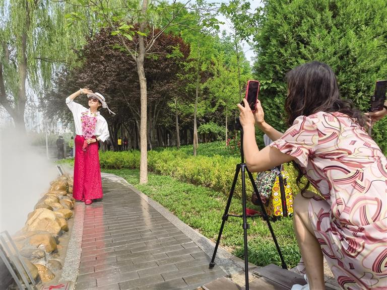 “一枝獨(dú)秀”團(tuán)隊(duì)的王大姐和姐妹們帶著專屬攝影師正在這里攝影留念。王大姐告訴記者,這是她們今年第2次來這里打卡。“這里的花真美,每年我們都會(huì)來,拍照發(fā)在網(wǎng)上,收獲無數(shù)點(diǎn)贊,心情別提多美了。”說話間,姐妹們又?jǐn)[了幾個(gè)造型,攝影師按下快門,精準(zhǔn)捕捉唯美瞬間。“4公里外的寓言故事園最近也特別火,過兩天我們就去打卡。”王大姐說。