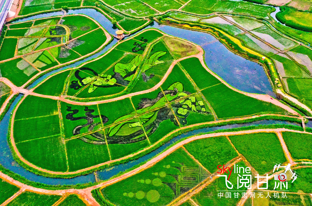 7月13日清晨,一場小雨過后,張掖市甘州區(qū)烏江鎮(zhèn)新河田園綜合體稻田景觀區(qū)內(nèi)2000多畝稻田塵埃盡洗,一幅幅彩稻畫栩栩如生,從高處俯瞰,田園風(fēng)光和生態(tài)美景展現(xiàn)在人們眼前。