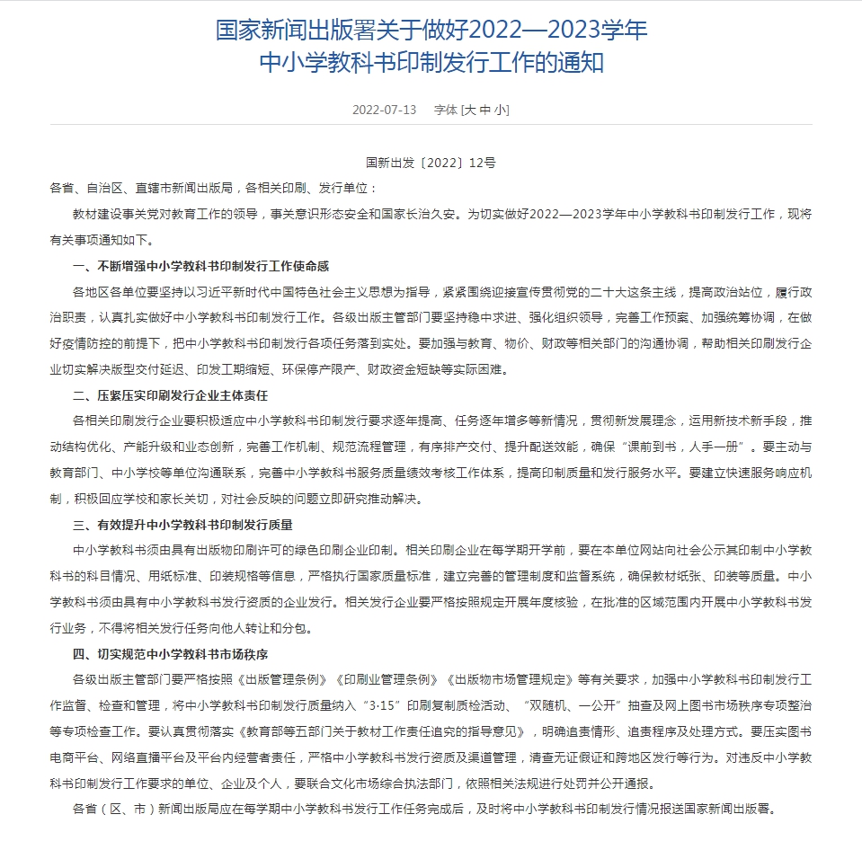 13日,國家新聞出版署網站發(fā)布《國家新聞出版署關于做好2022—2023學年中小學教科書印制發(fā)行工作的通知》(以下簡稱《通知》)。其中強調,各相關印刷發(fā)行企業(yè)要積極適應中小學教科書印制發(fā)行要求逐年提高、任務逐年增多等新情況?!锻ㄖ返淖詈蟊硎?,要切實規(guī)范中小學教科書市場秩序。