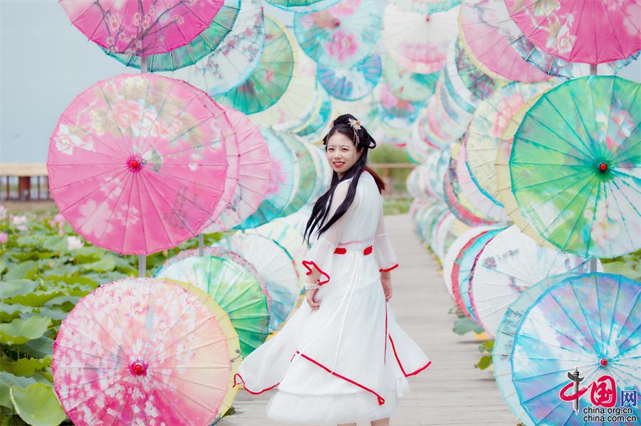 原標(biāo)題:寧夏沙湖: 接天蓮葉無(wú)窮碧 國(guó)風(fēng)漢服映荷塘(圖)